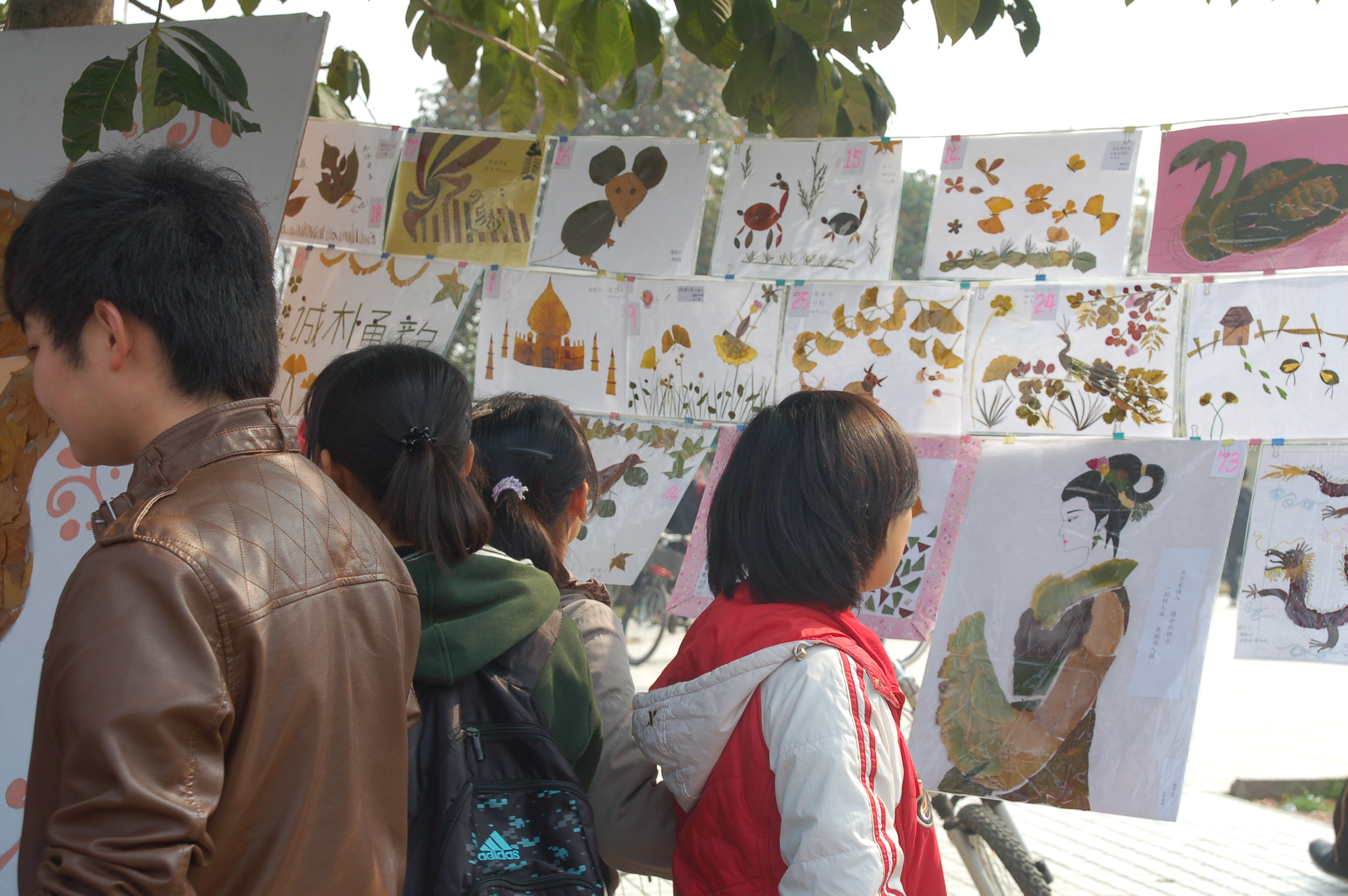 活動(dòng)過(guò)程中,不少同學(xué)均在感嘆用那不起眼的落葉竟然可以拼湊出這么漂亮的圖案,不少同學(xué)甚至用手去觸摸拼圖,感受落葉重新釋放的藝術(shù)氣息。在秋天這個(gè)詩(shī)情畫(huà)意的季節(jié)里,同學(xué)們拋開(kāi)了黛玉葬花的傷感,加上自己天馬行空的創(chuàng)意,拾起那片片落葉來(lái)展現(xiàn)我院的專(zhuān)業(yè)特色,讓那些飄零的樹(shù)葉重新綻放了它們的生命。葉子在同學(xué)們創(chuàng)造性的思維中再度飄揚(yáng),本次畫(huà)展向全校同學(xué)們呈現(xiàn)了一場(chǎng)非凡的視覺(jué)盛宴!